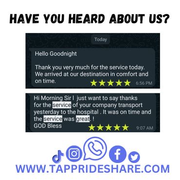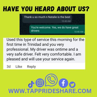 The most affordable transportation company in Trinidad and Tobago. One can gain full access to all of its services by going to your iOS or android app store and downloading "Tapp Rideshare Passenger." You can also call or whatsapp 1868-365-TAPP (8277)